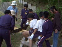 | 長い木もそのままチップに | ベンチ作りです | 座板に穴を開けて足をつけます |